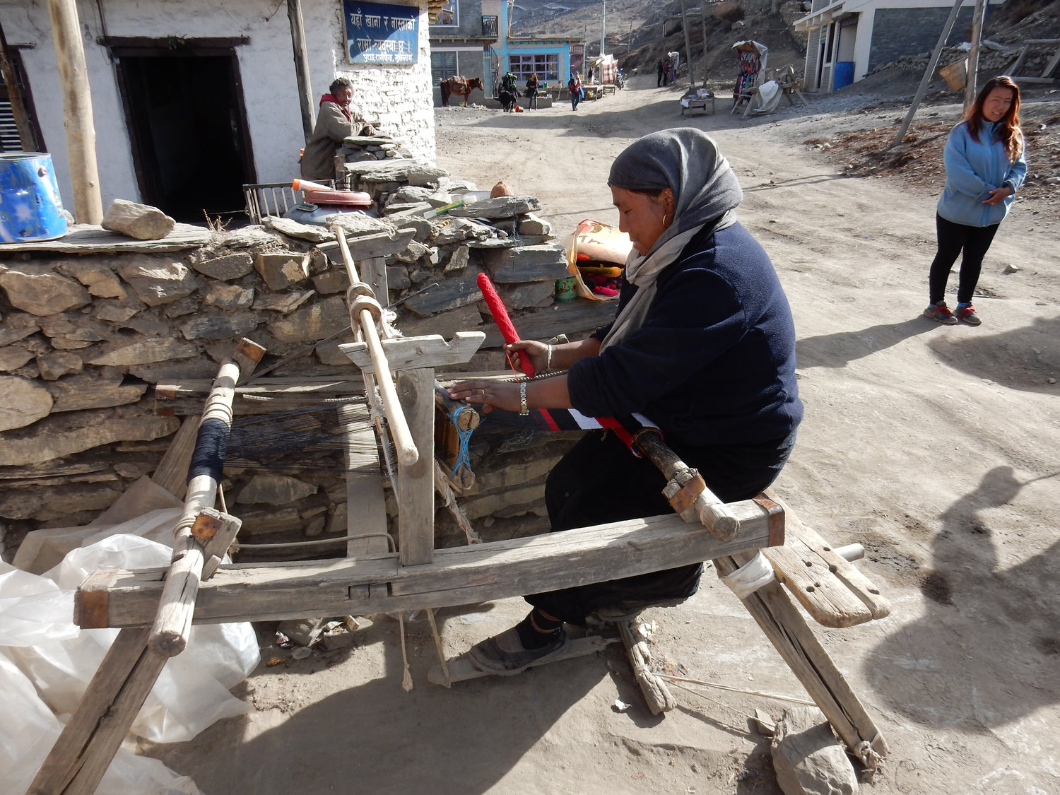 Daar zagen we van dichtbij hoe onze sjaals worden geweven: op een traditioneel houten weefgetouw, buiten op de straat, in het dorpsleven van de Himalaya. Deze foto hebben wij zelf gemaakt, een momentopname van echte ambacht in een uniek bergdorp.