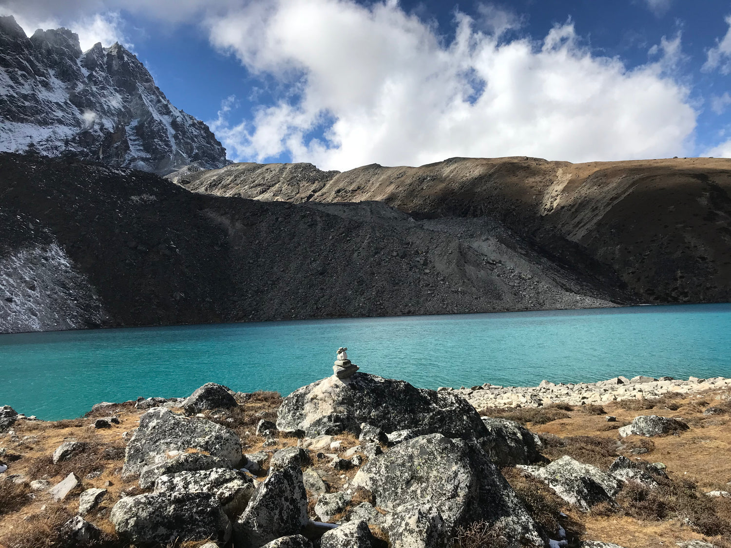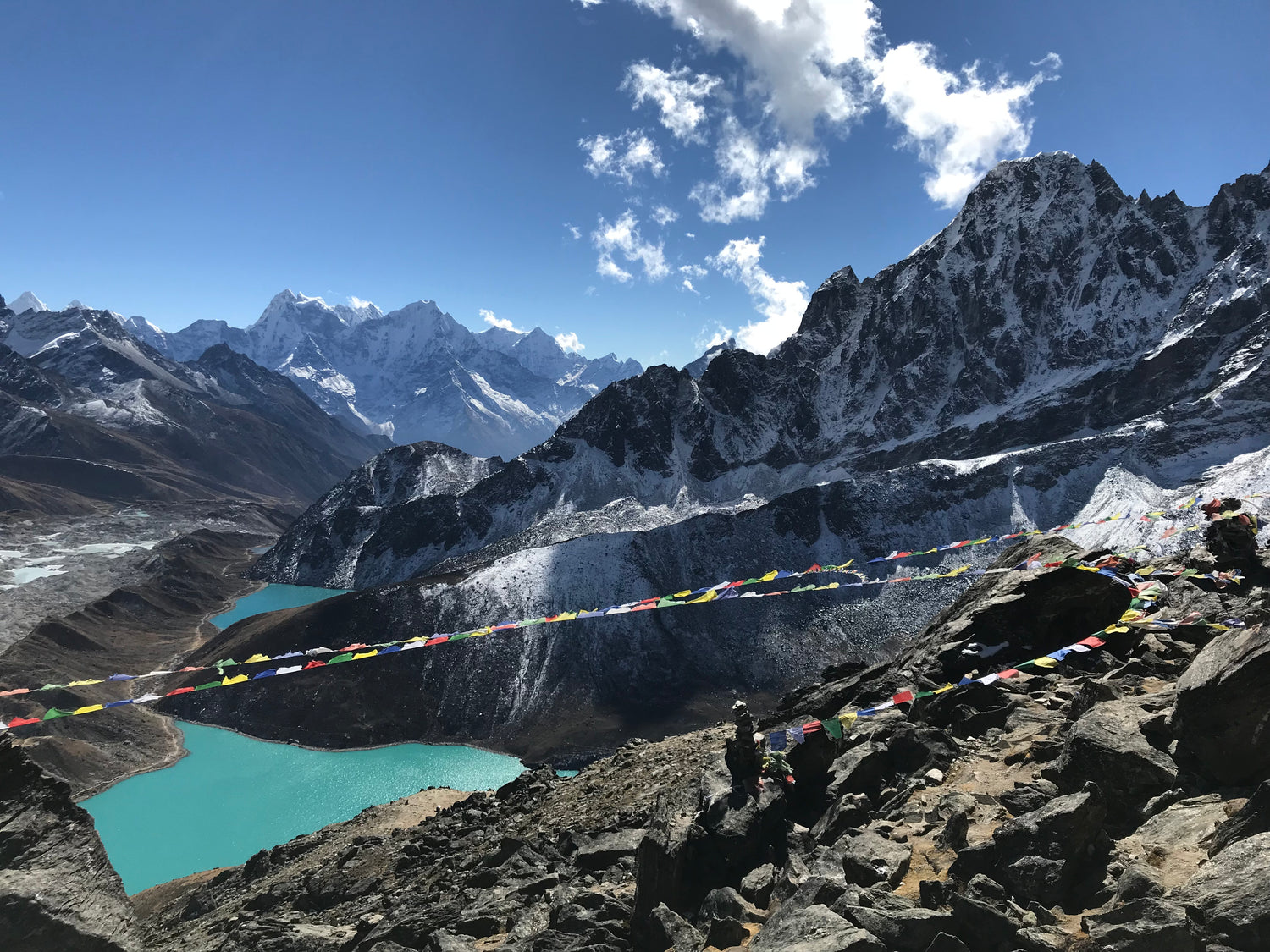 Onze tweede wandeltocht voerde ons over de indrukwekkende Everest drie passen route: over Kala Pattar (5545m), Everest Base Camp (5365m), Cho La (5300m), Gokyo Ri (5340m) en Renjo La (5360m). Tijdens deze tocht bereikten we het schitterende Gokyo-meer, omringd door de majestueuze bergen van het Everestgebied. Over het ruige landschap wapperen kleurrijke gebedsvlaggen, die
